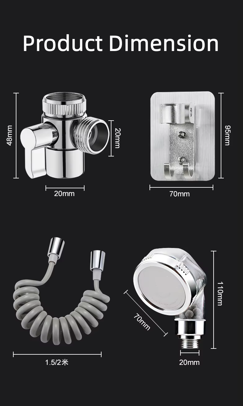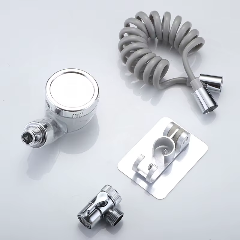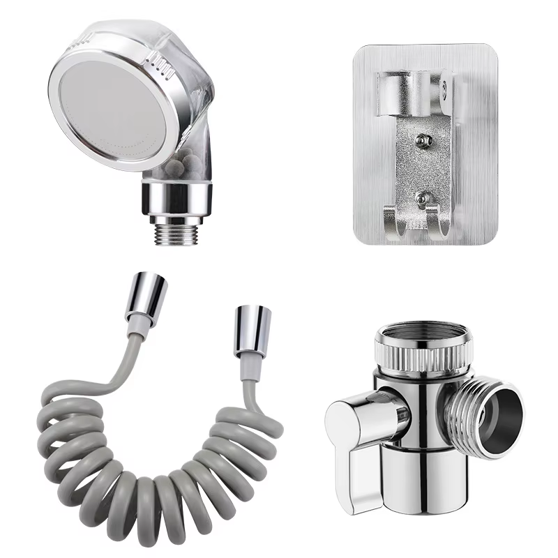 العلبة فيها كلشي غادي تحتاجو: رشاش الدوش بالفلتر ديالو، تيو مرن، علاّقة كتلصق فالحيط، والأدابتور لي كيجي مع جميع أنواع الروبينيات.